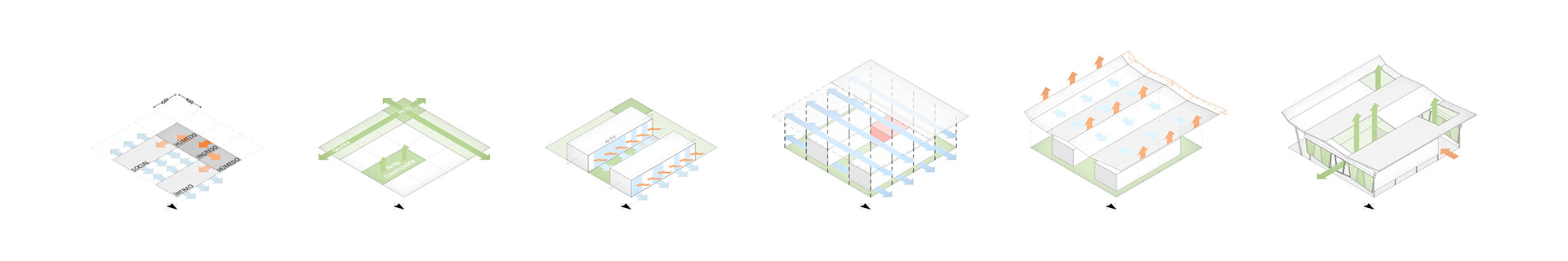 The house consists of two main blocks: an intimate block and a social block, connected by a third block that includes service areas. The intimate and social blocks are aligned along an east-west axis to optimize solar orientation and cross ventilation. These blocks are united by the heart of the house, the Patio Climatizador, a central green space that regulates temperature and solar radiation, serving as the nucleus and focal point of the design.