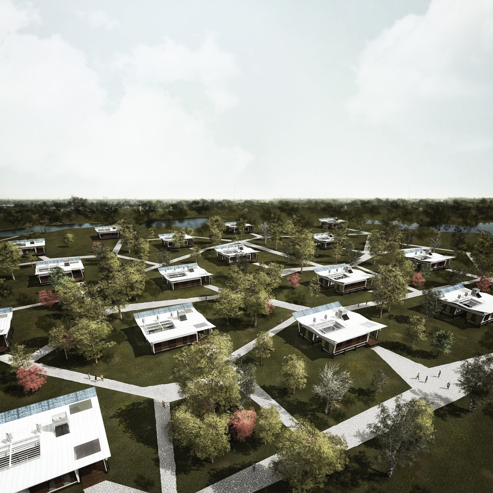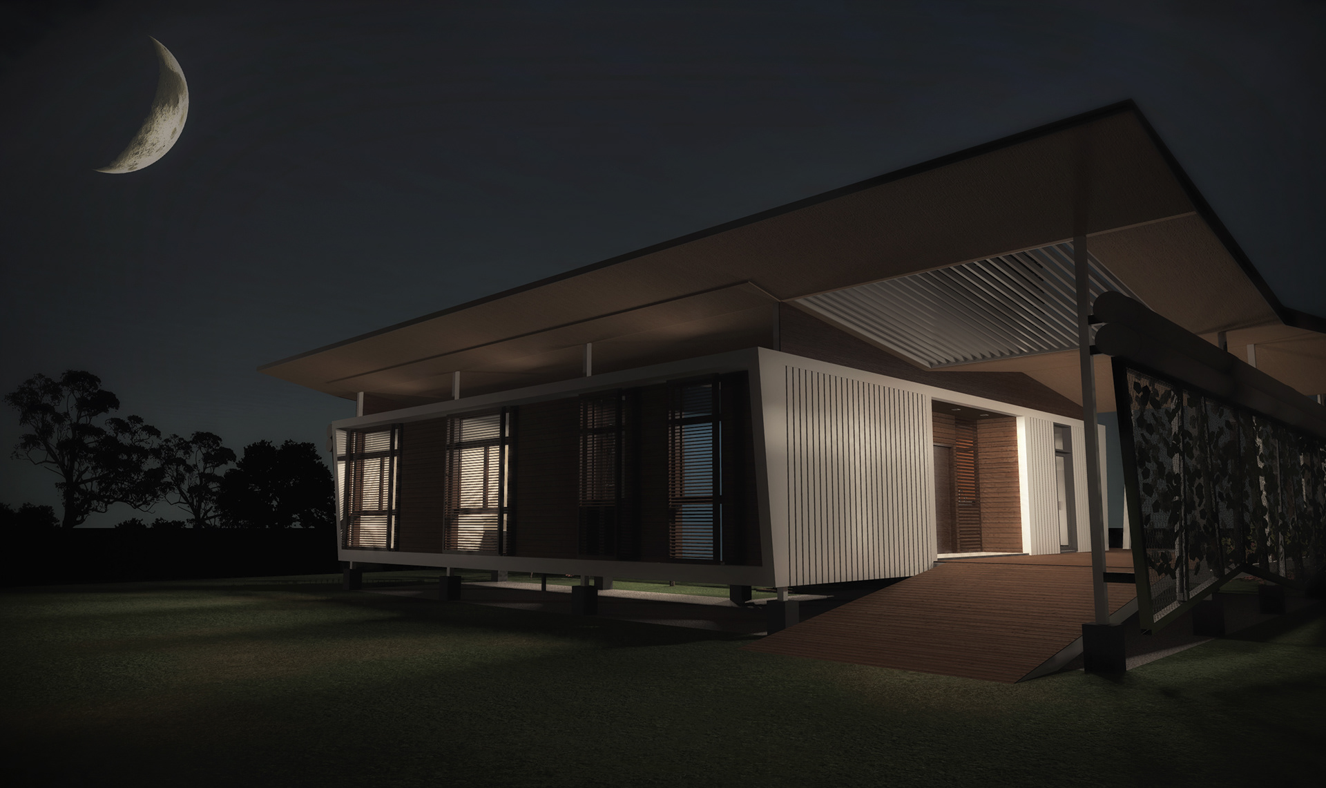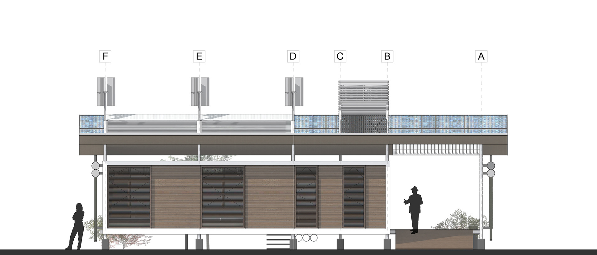 Built using a dry, lightweight, modular Steel Frame system, the house is elevated and features a double roof system. This design creates shaded, floating blocks that allow air to flow freely beneath. The double roof is strategically angled for rainwater harvesting, solar collection, and wind conduction. Additionally, it is perforated to control the entry of sunlight into the house, creating various green spaces within the structure.