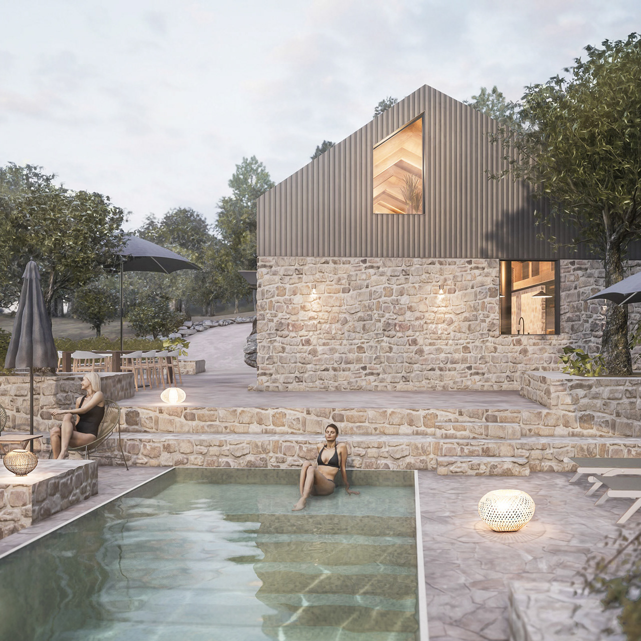 To capture the relaxed, beachy aesthetic desired by the client, the existing brick structure has been refreshed with a coat of white paint, complemented by light wood accents and soft concrete details. The palette of white, light wood, and greenery creates a calm and welcoming atmosphere.