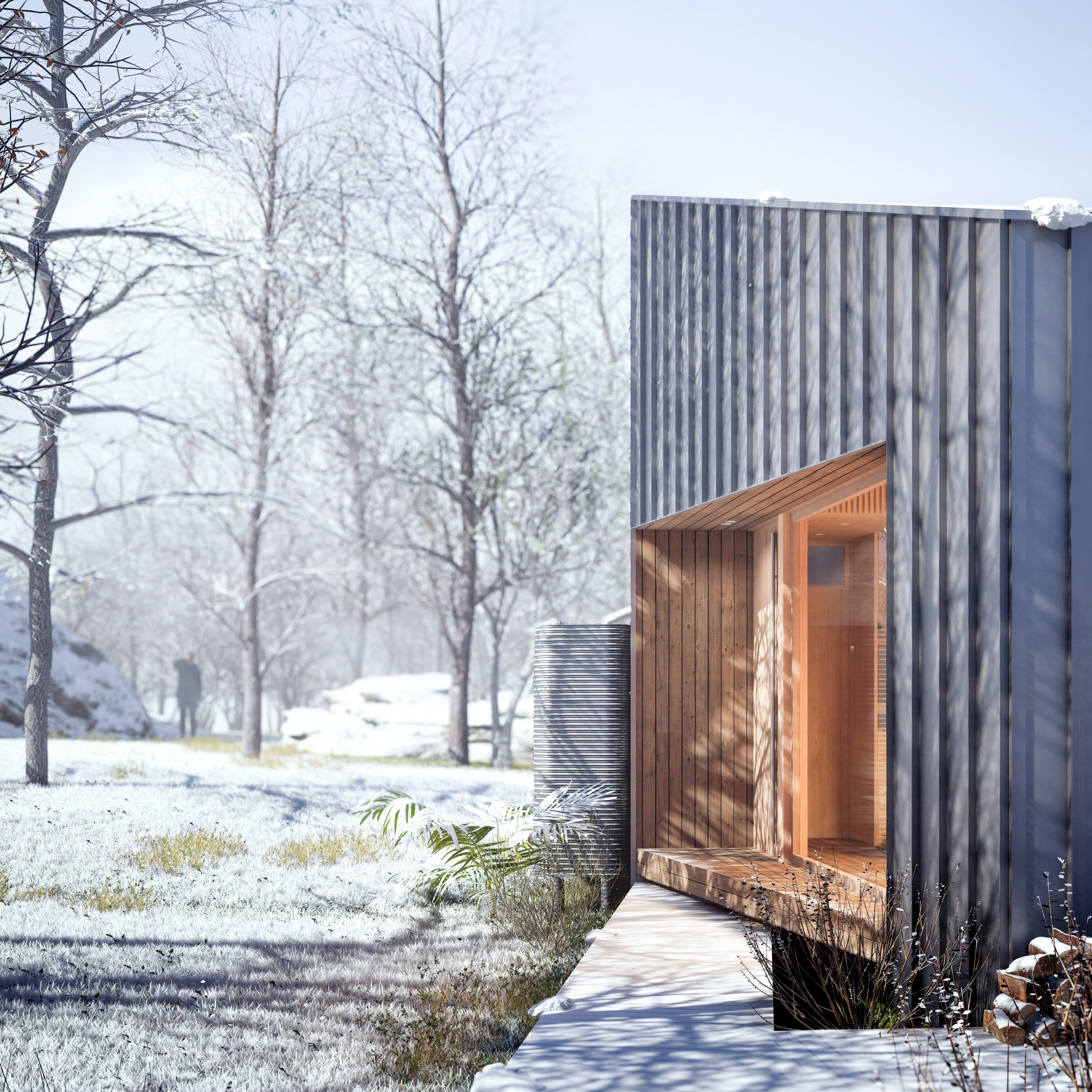 The aging roof is replaced with a modern structure, enhancing the villa's architectural profile. The new roof features a light grey metal cladding on the outside, which harmonizes with the natural stone exterior, while the interior showcases exposed wooden beams, adding warmth and a rustic touch. The increased roof height allows for the creation of a wooden mezzanine, adding a cozy yet spacious living area that capitalizes on the vertical space.