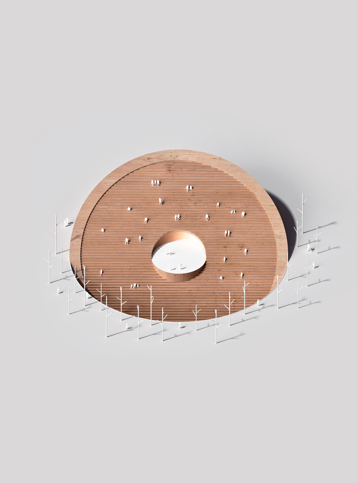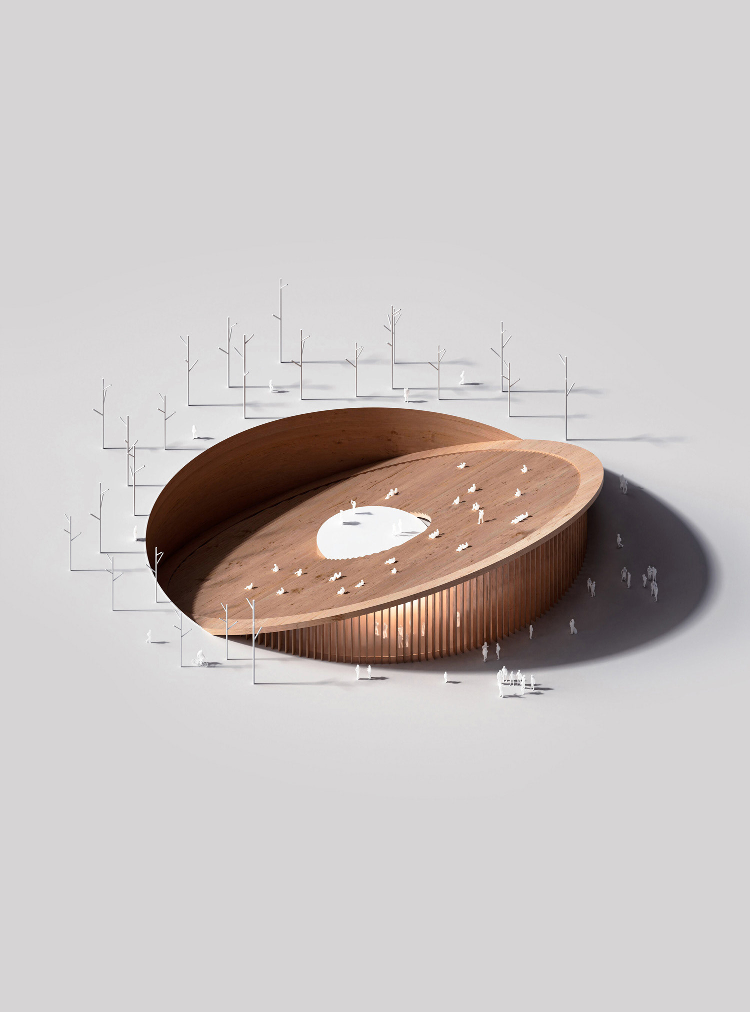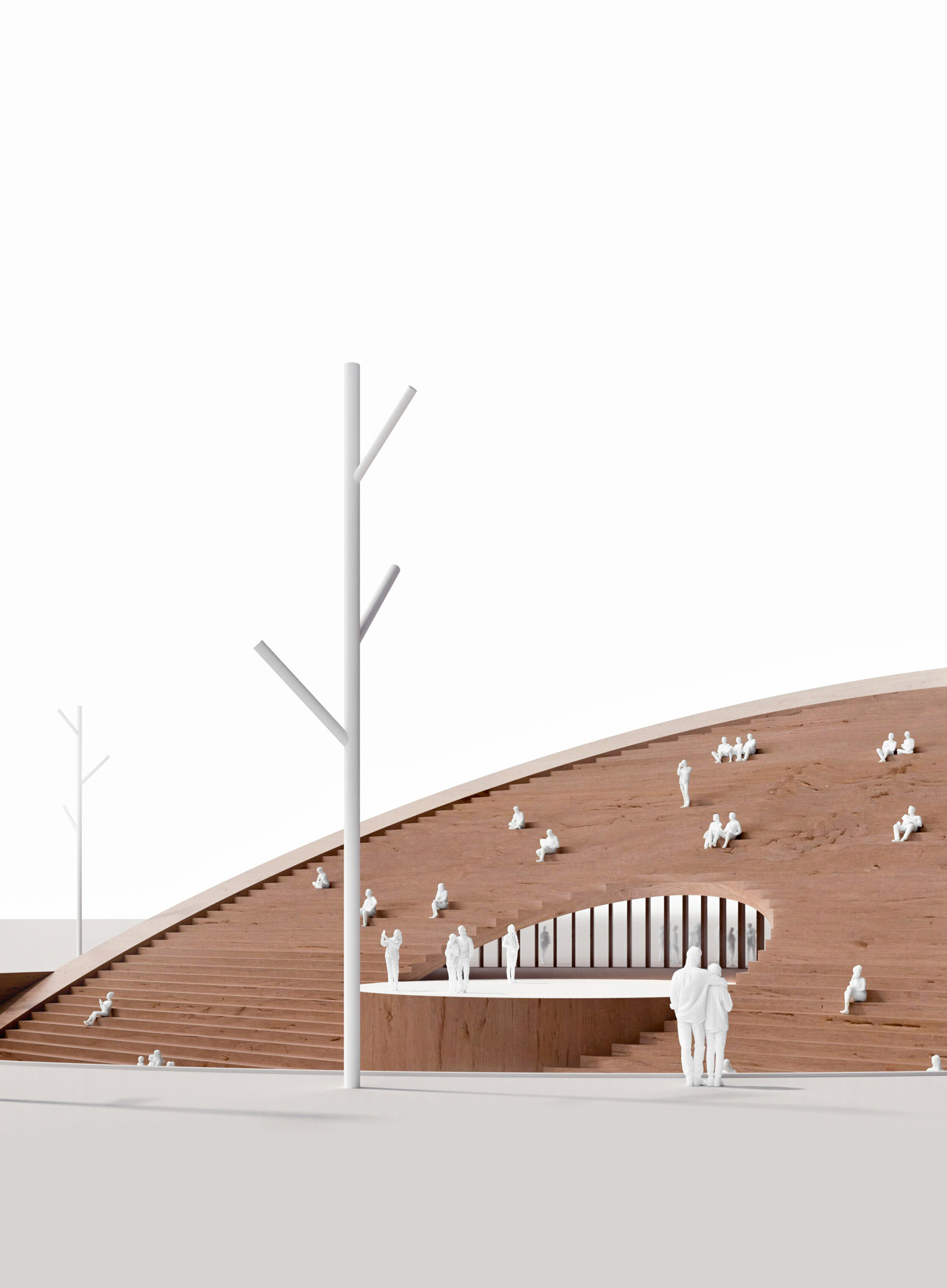This rotation simultaneously produces a sheltered space above and a carved void below, where the inclined surface becomes inhabitable, forming seating and stepped platforms reminiscent of an amphitheater. The concept explores how a simple geometric gesture can define multiple spatial conditions through movement and orientation.