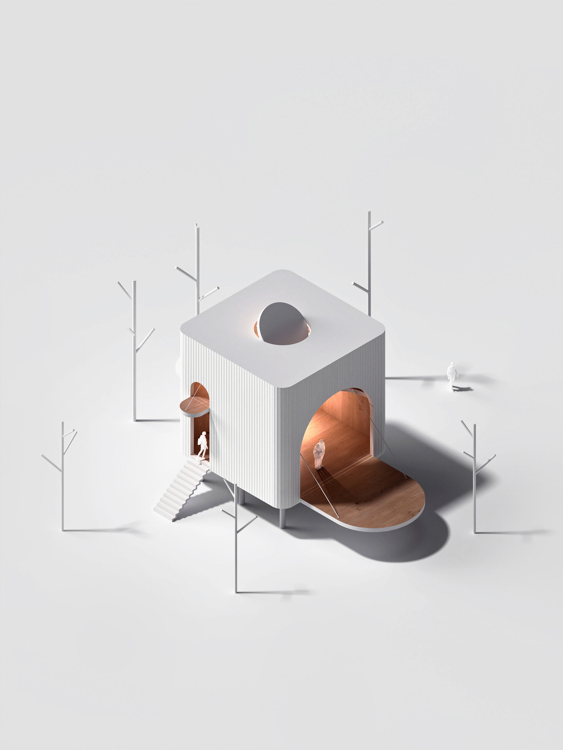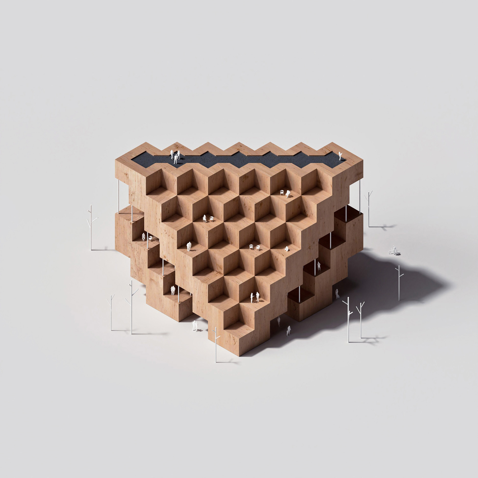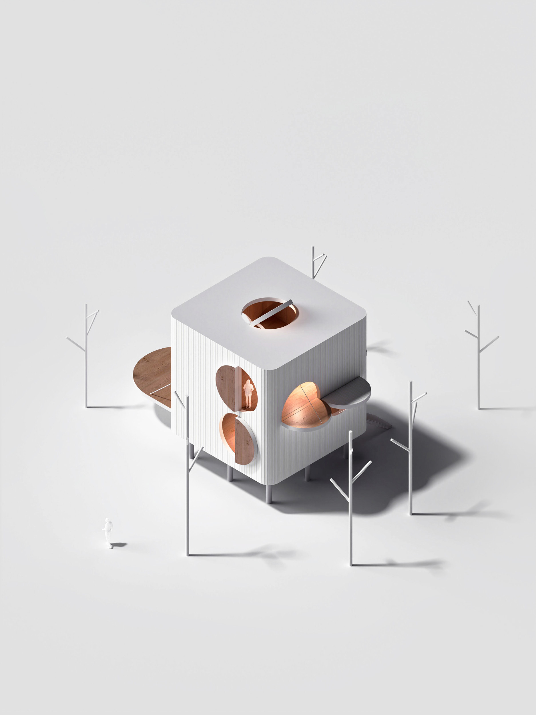 Carved sections are not only voids, but displaced solids that reappear as decks, awnings, or platforms, giving each opening a functional role. When closed, the object reads as a simple cube; as it opens, the architecture gradually reveals its spatial complexity.