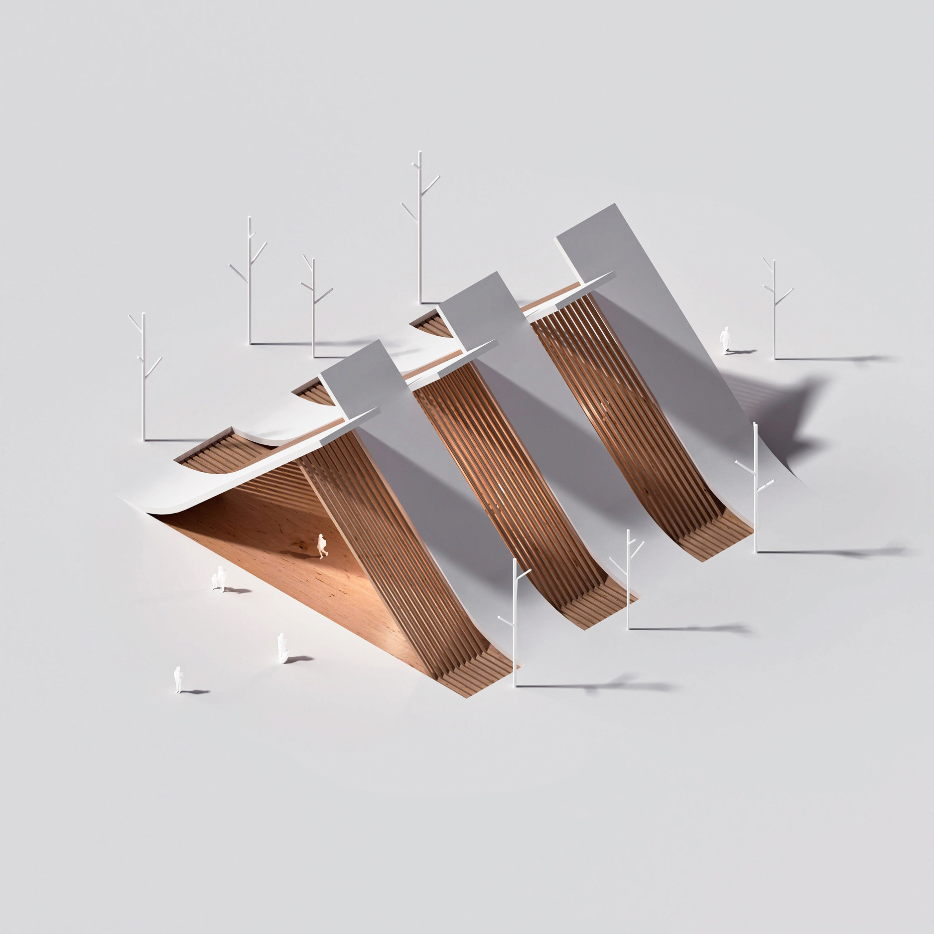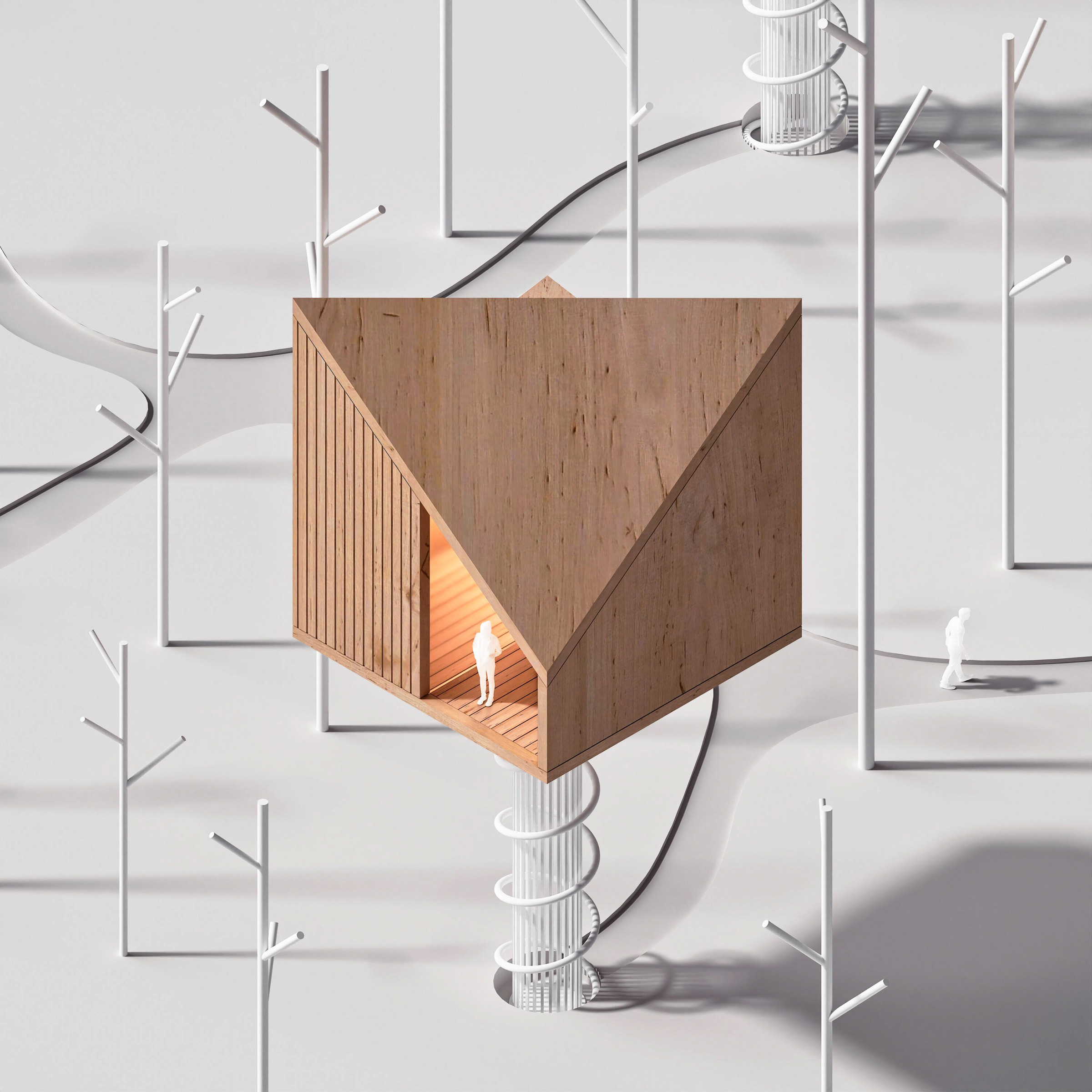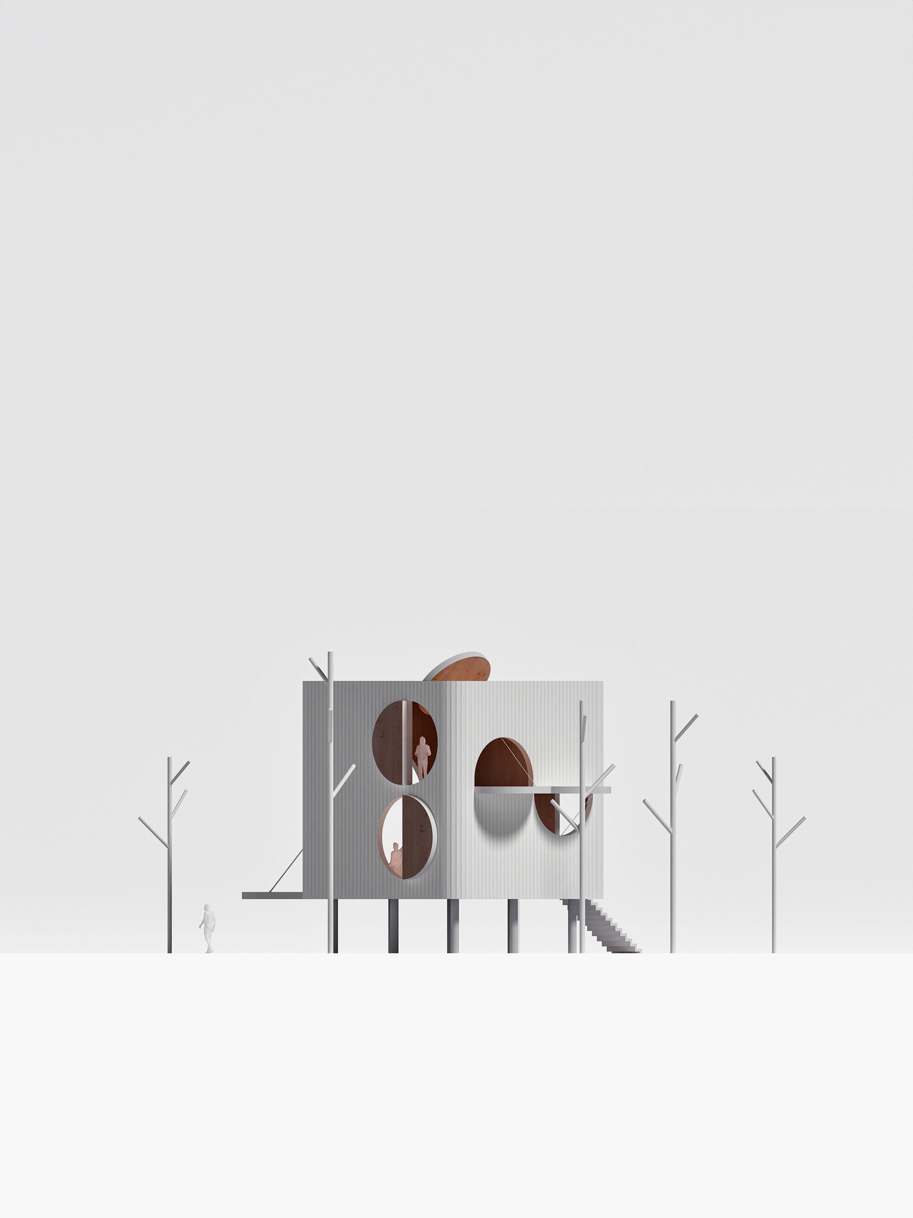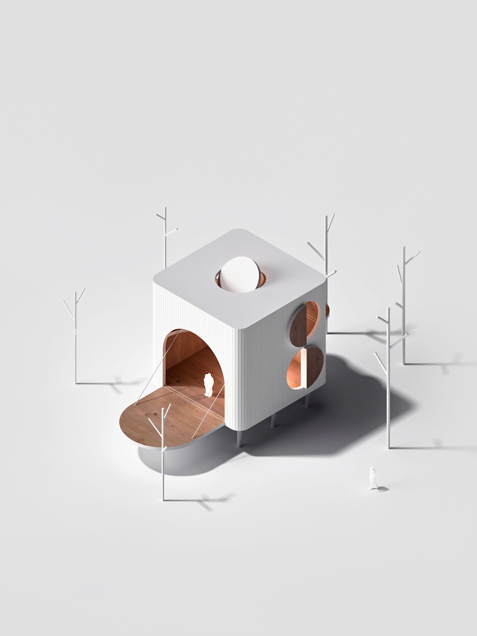 Carved sections are not only voids, but displaced solids that reappear as decks, awnings, or platforms, giving each opening a functional role. When closed, the object reads as a simple cube; as it opens, the architecture gradually reveals its spatial complexity.