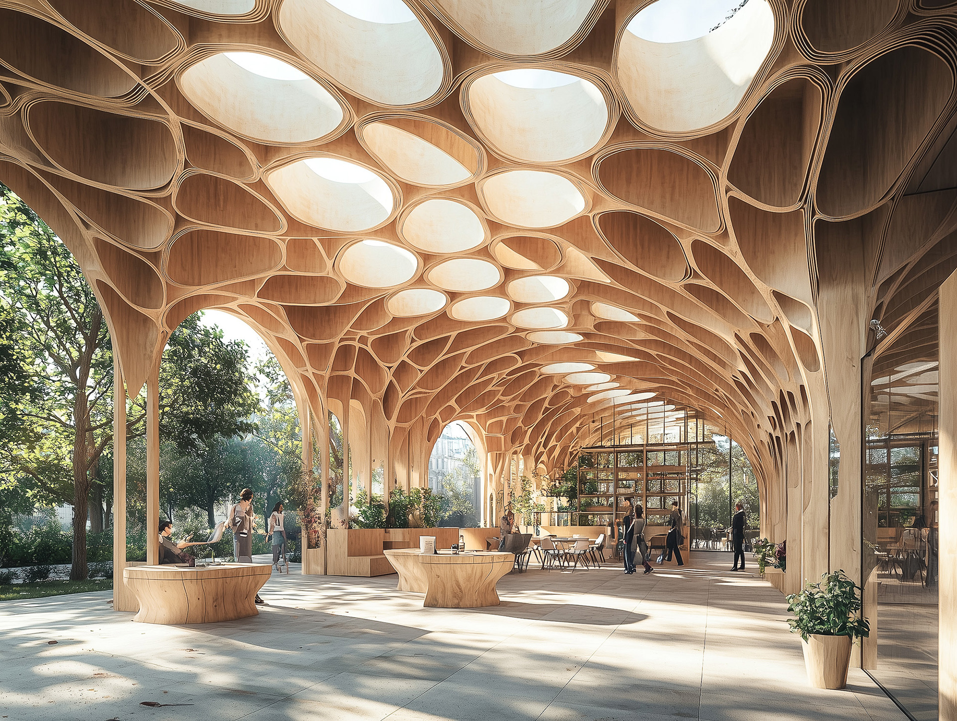 The final series embraces geometric patterns, primarily triangles and squares, to achieve a more structured and precise aesthetic. The tessellated wooden frameworks create a sense of order and strength while maintaining the warmth of natural material. Despite the angular forms, the spaces feel inviting, with the texture of the wood softening the modern, grid-like design, blending traditional craftsmanship with contemporary architecture.