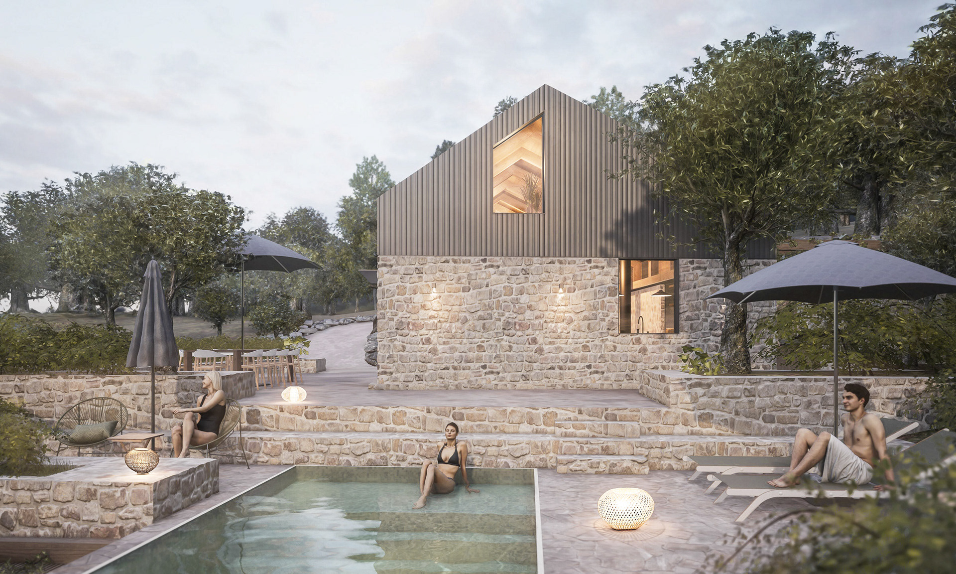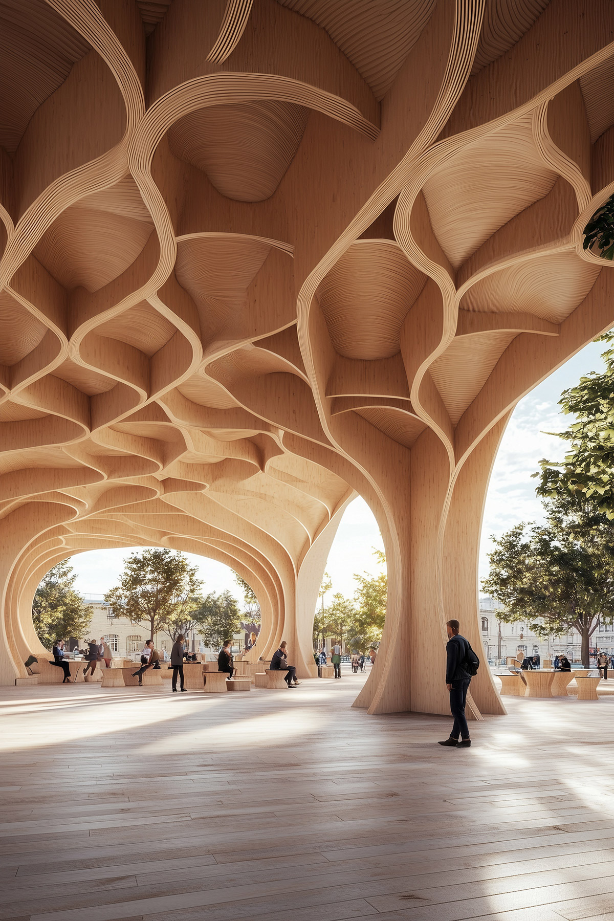 The second series explores organic shapes, with flowing lines that mimic natural forms like tree branches and waves. The wooden structures blend with their surroundings, creating dynamic, almost living spaces. This approach emphasizes a connection to nature, using light and shadow to accentuate the architecture’s fluidity, resulting in tranquil, immersive environments.